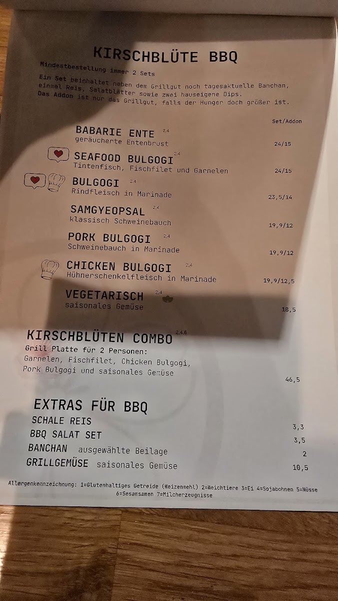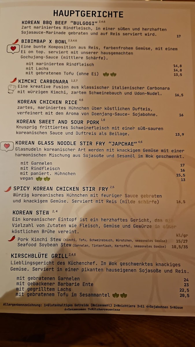 The menu at Kirschblüte Nt Cottbus feels carefully curated, balancing comfort, variety, and a clear Asian influence that works well as a complete dining experience. Dishes like Bibimbap anchor the menu with a satisfying mix of rice, vegetables, and bold seasoning, while the house specialty Kirschblüten Barbecue stands out for its rich, savory character and shareable appeal. Lighter starters such as Gyoza, Spring Roll, and Oktopusbällchen provide a crisp and flavorful introduction, offering contrast in both texture and taste. For guests seeking something more refined, Sushi Menü 300 delivers a composed selection that highlights freshness and balance, complemented well by simple yet elegant options like Lachs. The ramen selection adds depth to the menu, with Kb Tantan Ramen offering a spicy, nutty profile, while Ramen Mit Miso-brühe Und Barbarie-ente brings warmth and complexity through its aromatic broth and tender duck. Traditional flavors continue with Kimshi-suppe, which adds a fermented, slightly spicy note that enhances the overall range of the menu. To finish on a lighter note, Mochi Eis provides a soft, subtly sweet dessert option that pairs naturally with Grüner Tee, rounding out the meal in a calm and refreshing way. Taken together, the menu feels cohesive and well-paced, offering enough variety to satisfy different preferences while maintaining a clear identity rooted in bold flavors and comforting classics.
